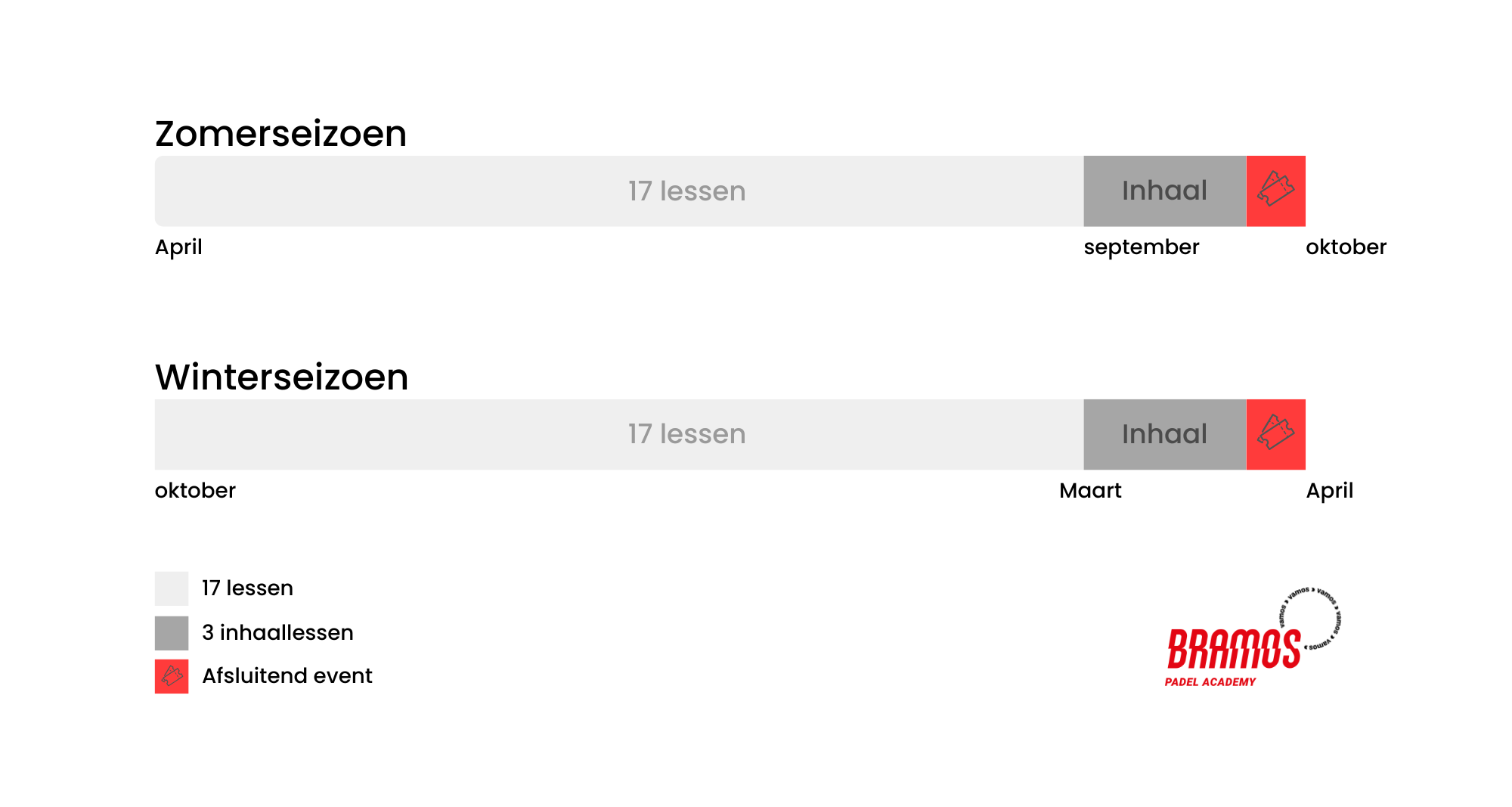 Het zomerseizoen start in april, het winterseizoen in oktober. We proberen iedereen een lesoptie te bieden, maar vanwege beperkte beschikbare plekken lukt dit niet altijd.